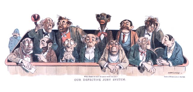 | Caricatura (circa 1915) que retrata un jurado en los Estados Unidos (EE.UU.) La leyenda reza: "Nuestro deficiente sistema de jurado" |